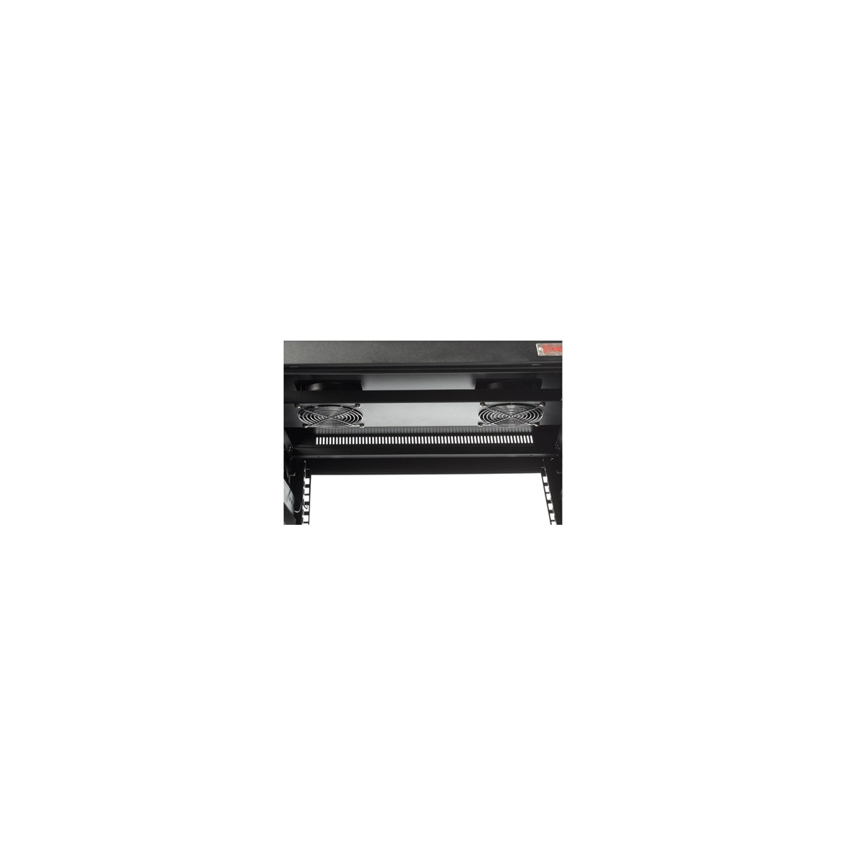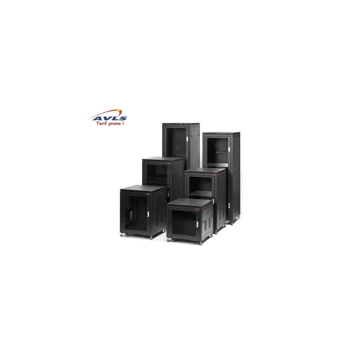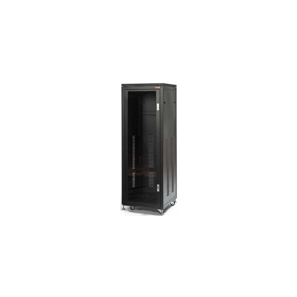 • Porte avant vérouillable en verre organique, chapeau ajouré pour ventilation avec 2 ventilateurs, ouverture sur le socle pour passage des câbles, patins caoutchouc réglables et roulettes pivotantes.