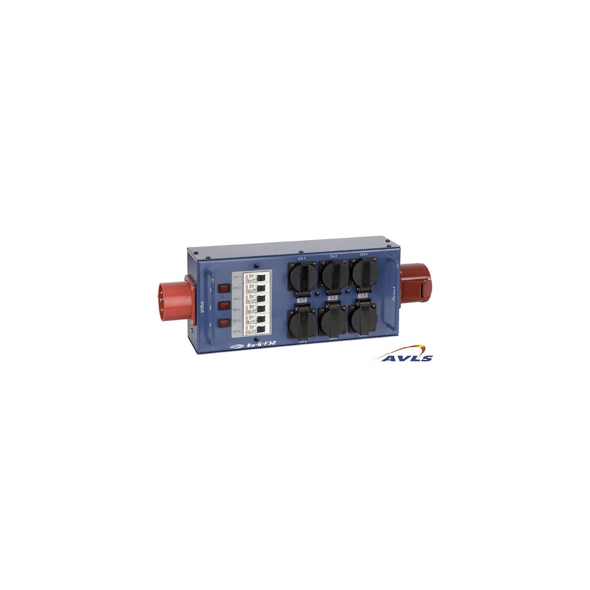 Bloc de distribution SHOWTEC SPLIT POWER 32 Répartiteur triphasé 1 x P17 mâle 5p rouge 380V 32A / 6 x PC femelles 3p 230V 32A Disjoncteur