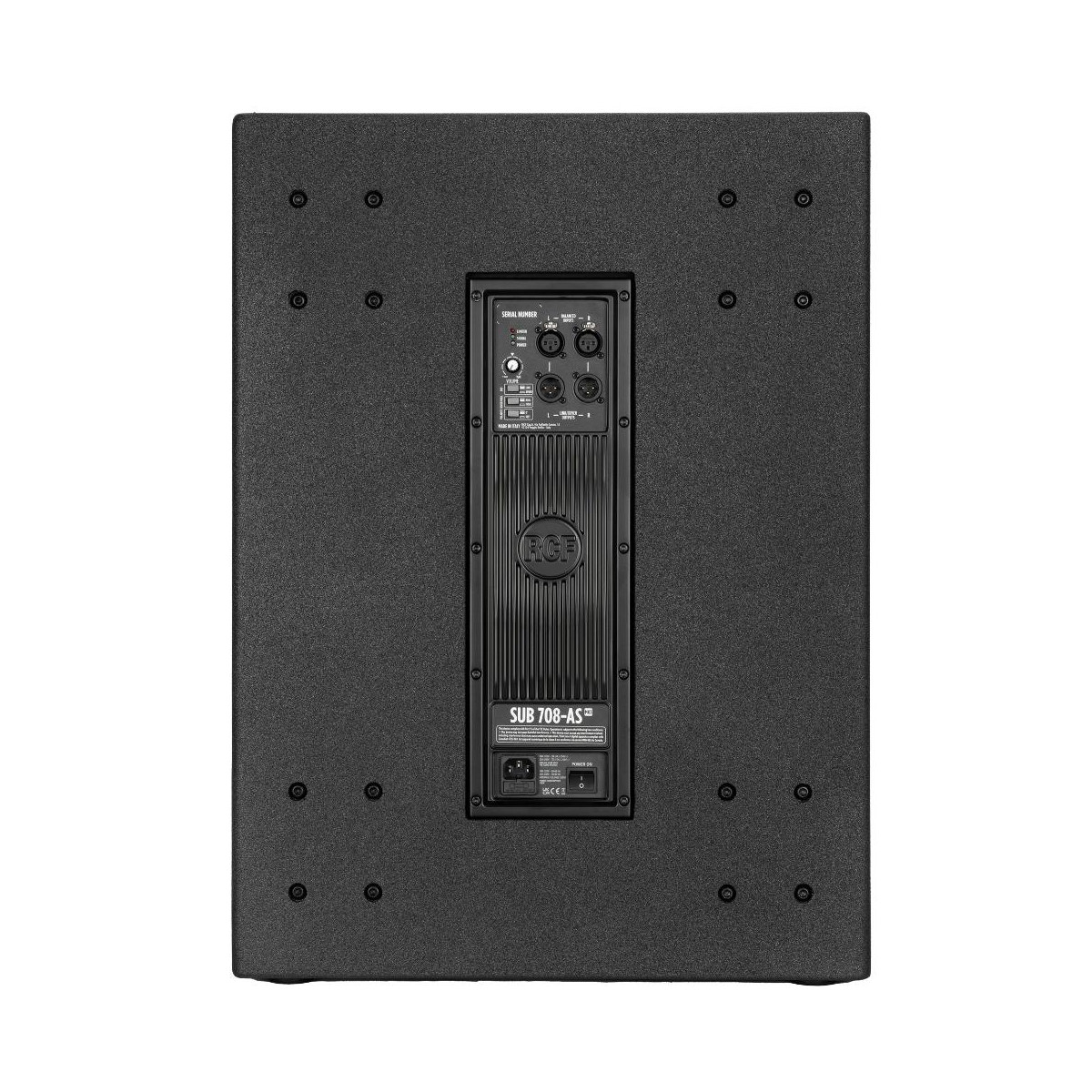 Les améliorations apportées par RCF à ses haut-parleurs les rendent plus solides et puissants, et l'amplification accompagne naturellement cette évolution. Avec une puissance crête de 1400 W, l'amplificateur Classe D intégré permet de générer des niveaux de pression extrêmes avec une attaque ultra rapide, une réponse réaliste des transitoires et un très faible échauffement. La conception du sub étant d’une grande efficacité énergétique, il n'est pas nécessaire d'utiliser un ventilateur de refroidissement. L’ampli est fixé à un dissipateur en aluminium massif sans pièces mobiles, situé à l'arrière du coffret. Le circuit d'entrée stéréo avec son filtre actif est d’une conception nouvelle, assurant une faible distorsion. Un limiteur perfectionné préserve le naturel du signal rentrant, à tous les niveaux. Tous les amplis RCF sont conçus selon la norme EN62368-1 pour une sécurité maximale, et leur alimentation à découpage allie efficacité élevée et poids minimal.