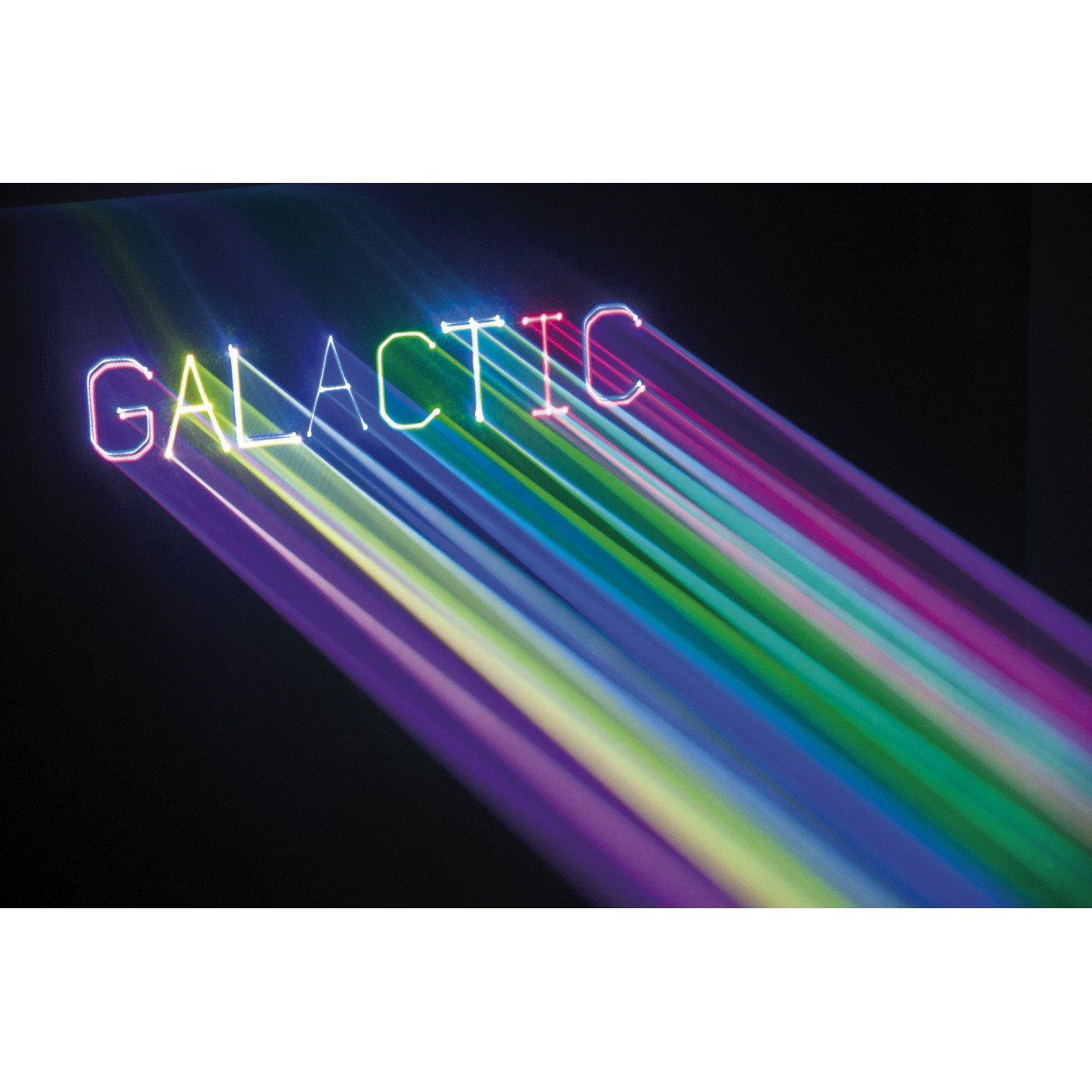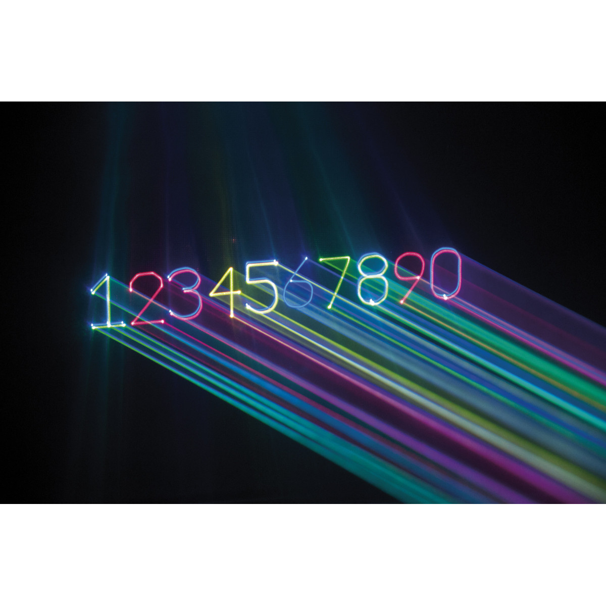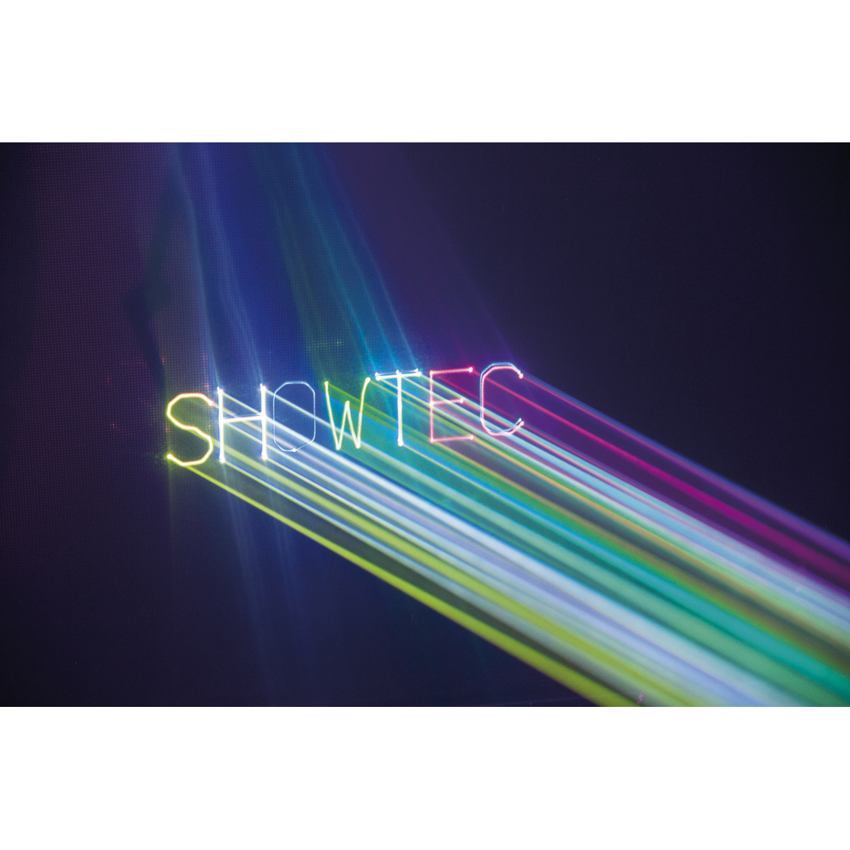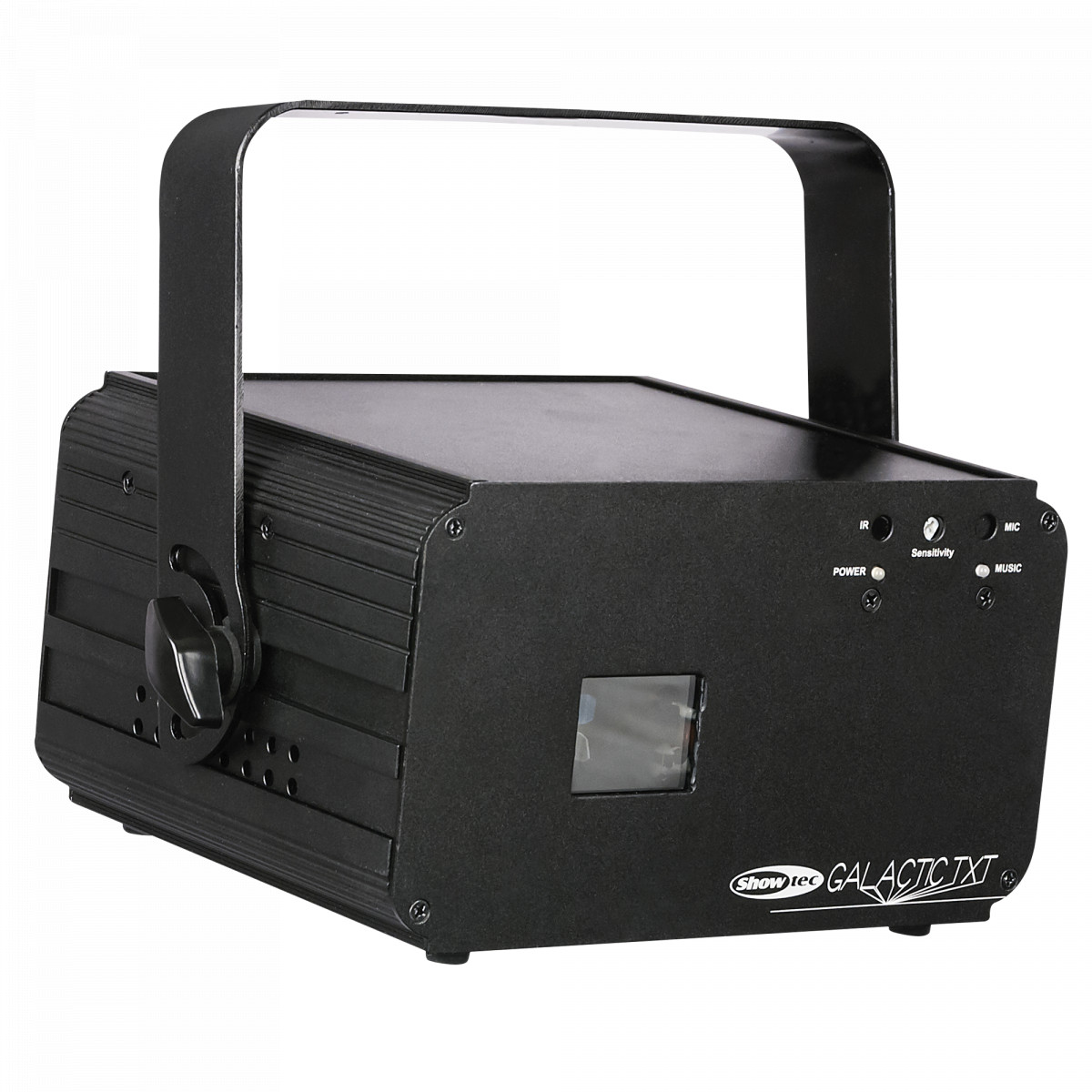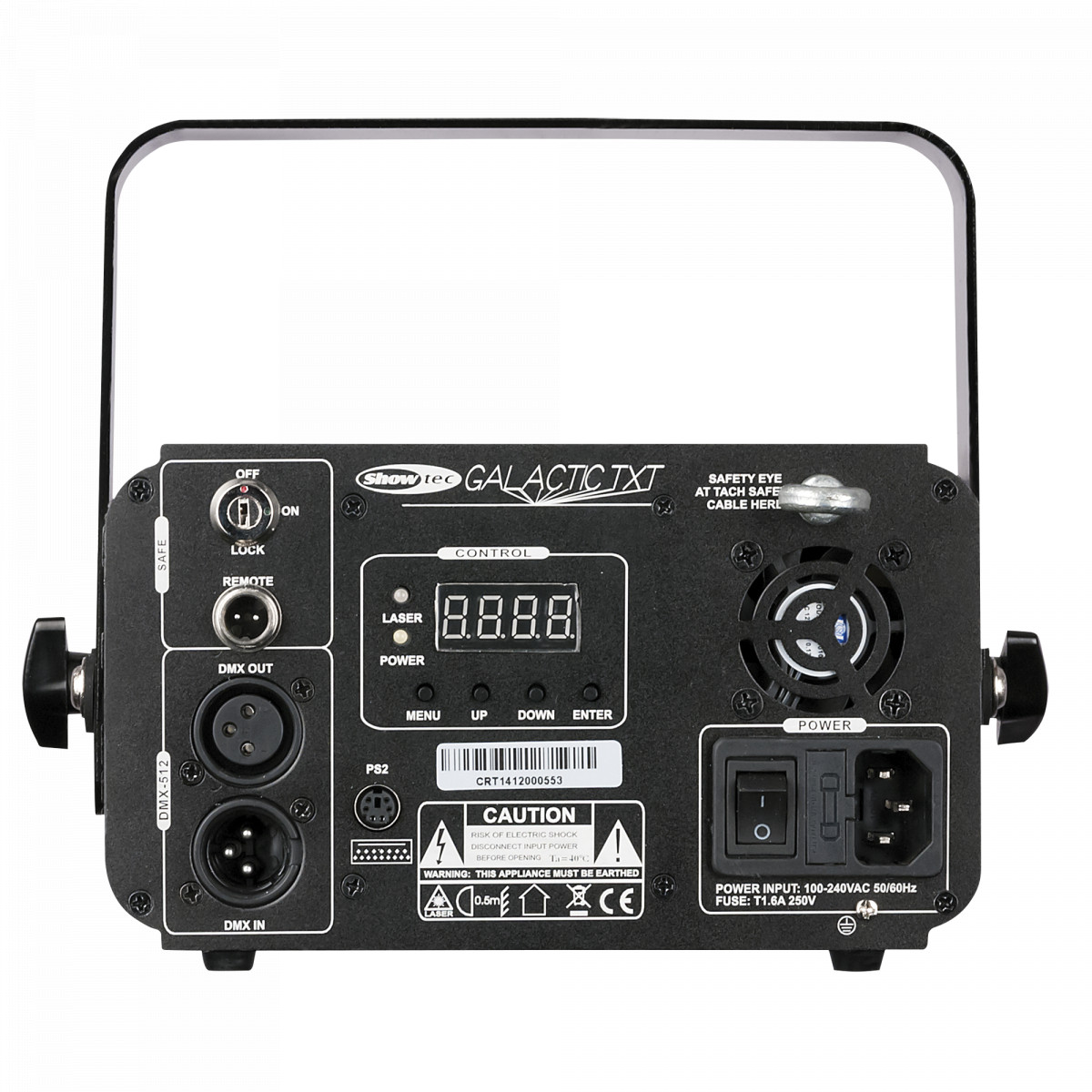 Le Showtec Galactic TXT est un projecteur laser de texte RGB de 300 mW pour l'affichage de textes, d'images et de symboles animés personnalisés et préréglés, adapté aux salles de spectacles. Ses 128 animations et symboles prédéfinis comprennent une horloge intégrée, un compte à rebours et une fonction de date avec zoom, mouvements, vague, dessin, rotation et effets de couleur. Le Galactic TXT est contrôlable par DMX, IR et Maître/Esclave en mode manuel, automatique ou contrôlé par le son. Il est livré avec un clavier, un connecteur de verrouillage, une touche de verrouillage et une télécommande infrarouge. Il convient aussi bien aux applications à courte distance qu'aux applications à longue distance grâce à son grand angle de balayage de 40° avec fonction zoom.