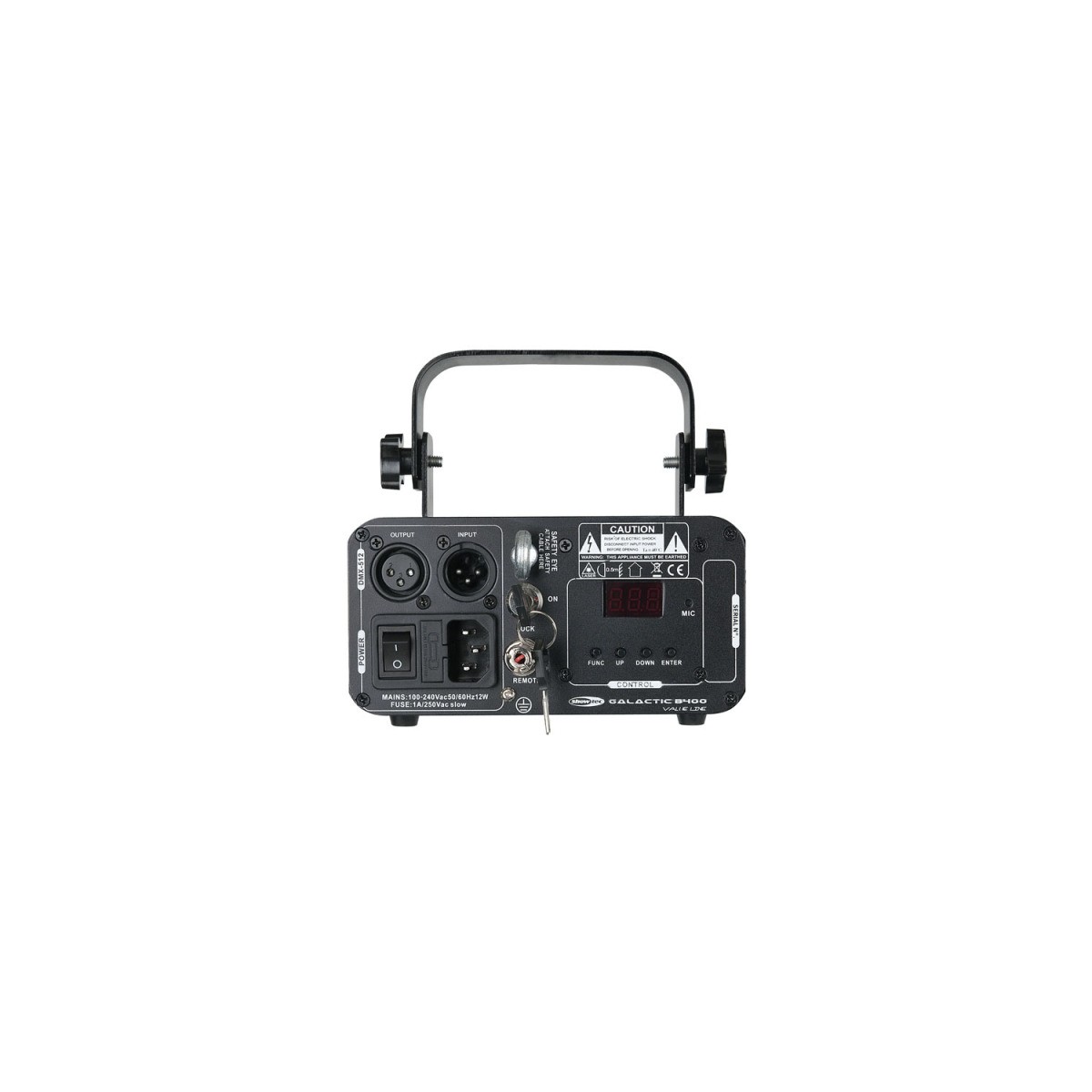 Le B400 est le successeur du laser bleu simple de la gamme Galactic Value Line. Avec un laser dont la puissance est superieure de 100mW celle du premier modele B, il beneficie d'une telecommande infrarouge. Tout comme le G40, il dispose de 8 canaux DMX et de 32 motifs differents.