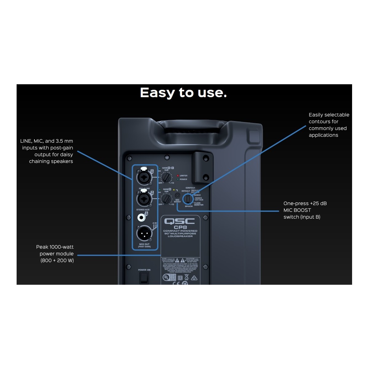 Sous ses lignes élégantes, l’enceinte CP intègre un amplificateur de puissance de 1000 watts à haut rendement, des transducteurs optimisés et un traitement numérique du signal perfectionné, offrant des performances au-delà de toute attente pour une enceinte compacte.