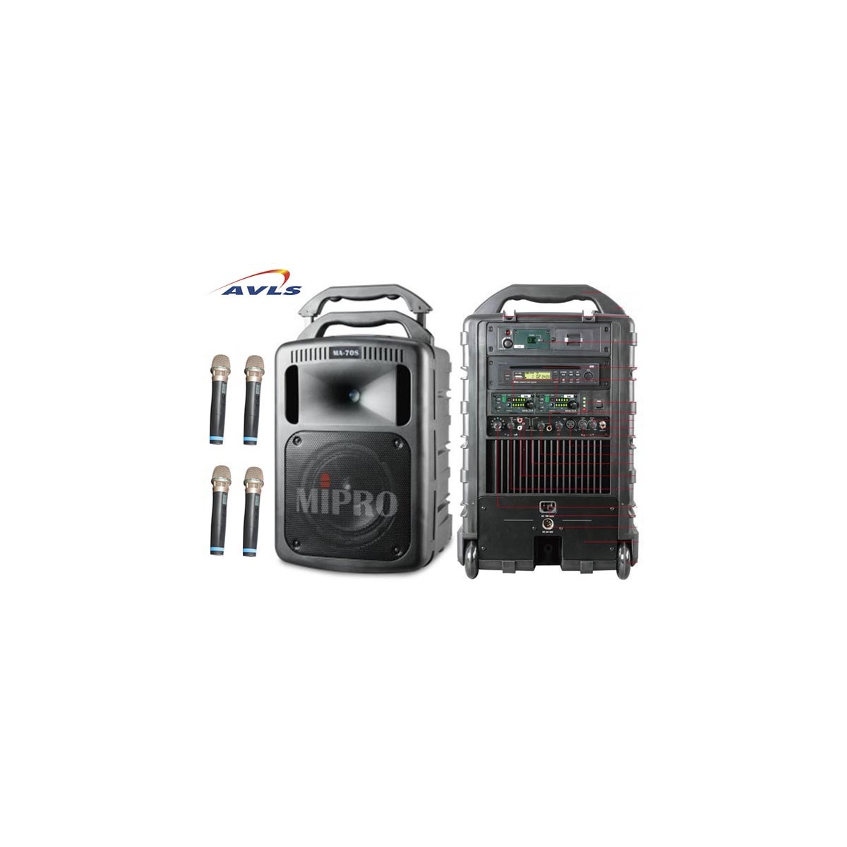 Sono portable batterie/secteur MIPRO MA 708 B (170 Watts) avec 4 micros main sans fil HF 16 fréquences pour 150 à 300 personnes (lecteur en option CD-Usb-MP3) (Durant la garantie : prêt en magasin gratuit d'un appareil similaire !)