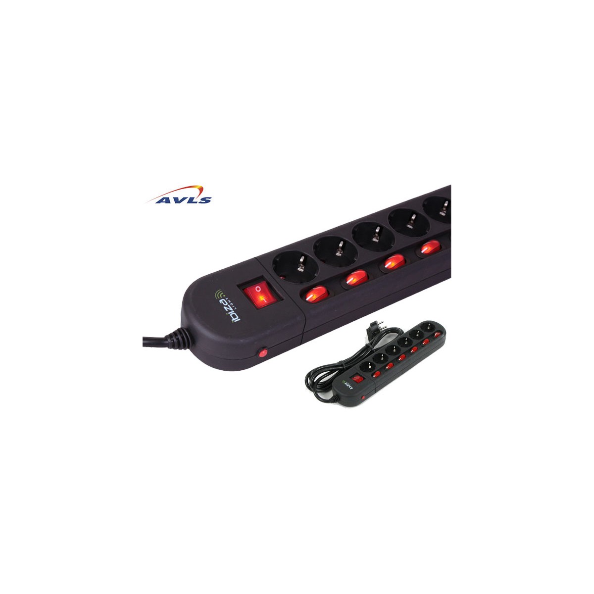 Location Multiprises avec 6 embases 10/16 Ampères 2 + T NF / 220 v / 3 x 1,50 mm (noir) avec 1 inters pour chaque sortie, Câble 3 mètres
