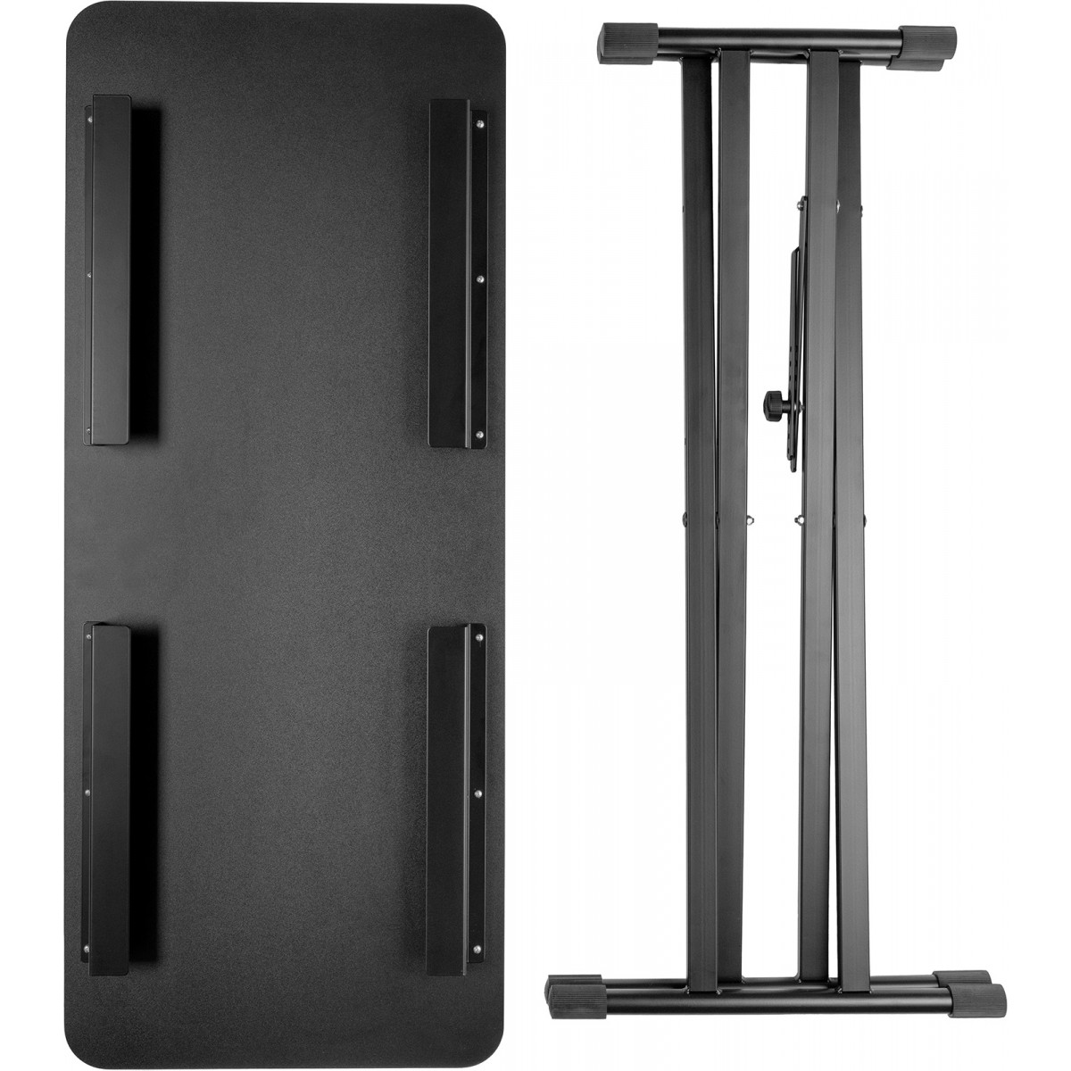 Cet ensemble polyvalent se compose du support de clavier 18963 et du plateau 18905 avec revêtement aspect carbone. Le plateau d'une dimension de 1100 x 450 mm offre suffisamment d'espace pour les contrôleurs, les tables de mixage, les ordinateurs portables, les synthétiseurs, etc.
