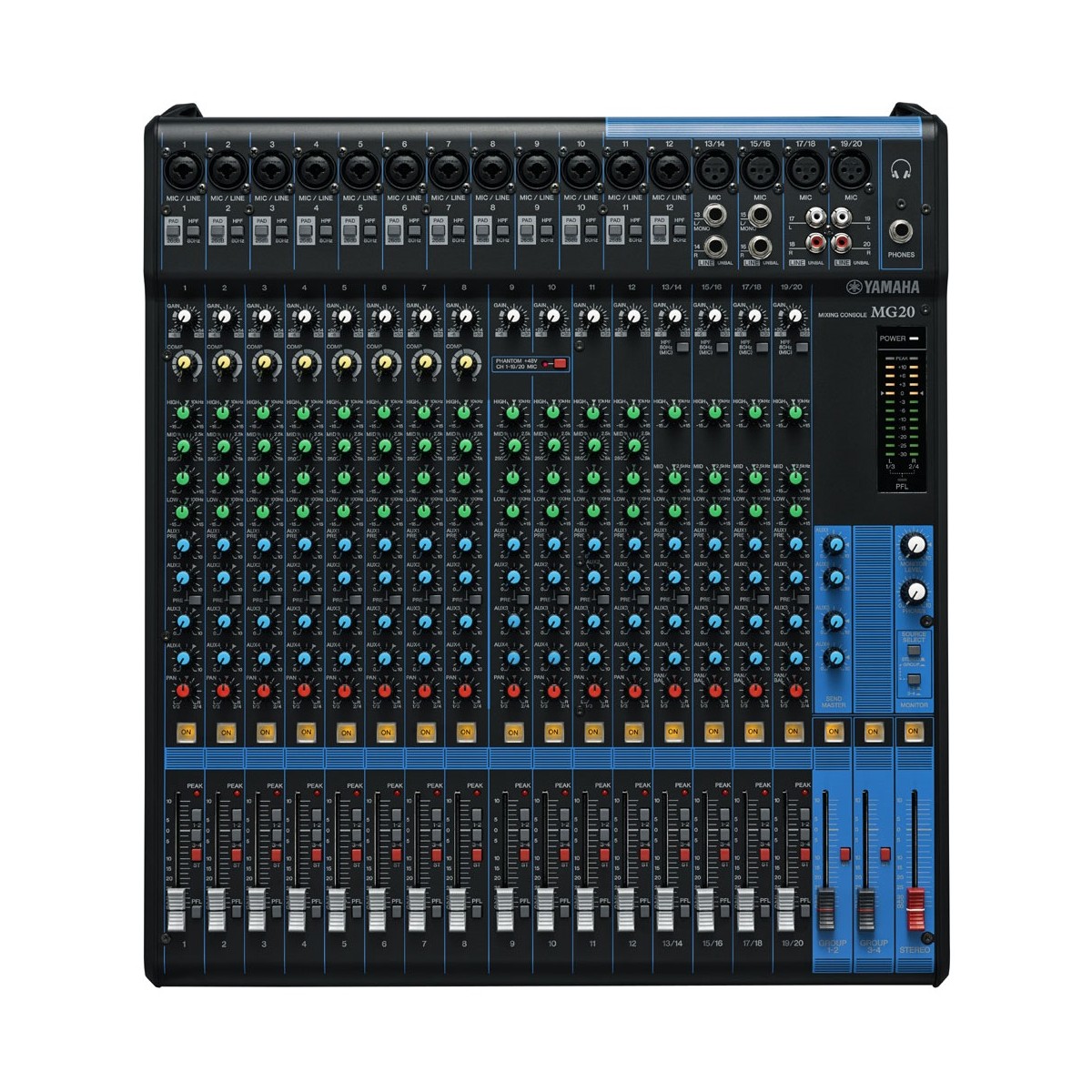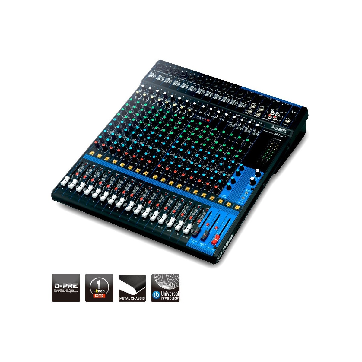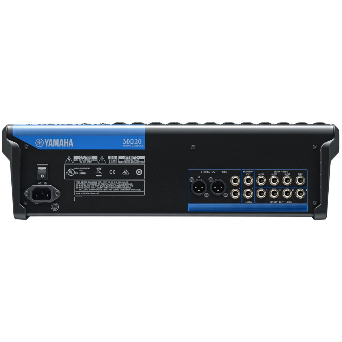 MG 20 Voici la 3ème génération de console Yamaha série MG : console de mixage analogique 20 canaux - 16 entrées micro, 20 entrées ligne (12 mono + 4 stéréo), 4 Groupes, 1 bus stéréo, 4 Aux.