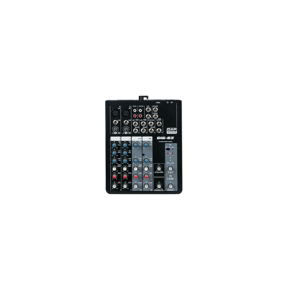 La console de mixage GIG-62 est dotee de fonctionnalites dont ne disposent pas les autres appareils de sa categorie: 2 entrees mono (fournies avec des preamplis micro tres faible bruit et une alimentation fante +48V) et 2 entrees stereo. Chacune d'entre elles dispose d'un egaliseur 3 bandes (frequences basses, mediums et aigu), d'un contre auxilliaire, d'afficheurs de niveaux 4 segments tres precis, d'entrees bipistes assignables au mixage principal et de sorties contre/casque ou groupe.